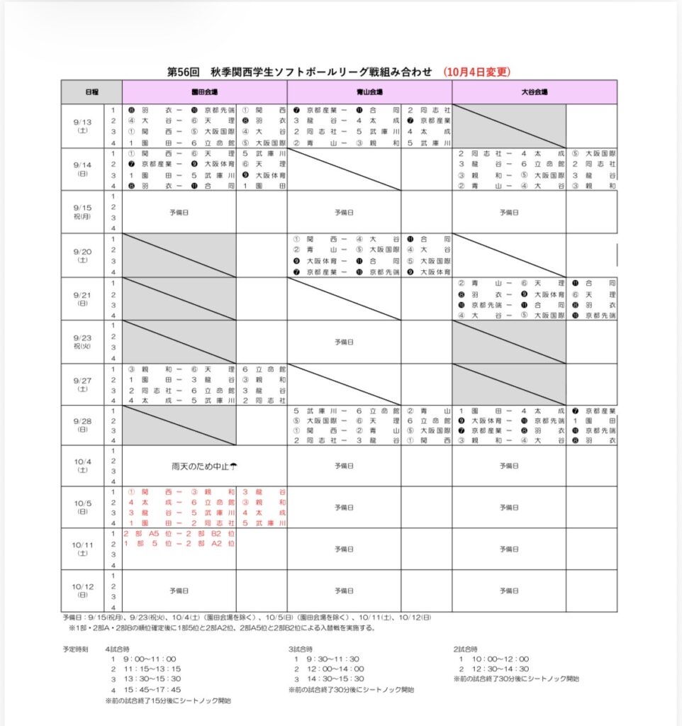 10月4日の試合は雨天のため中止となりました。本日の試合を明日に順延し、入替戦を10月11日に変更いたします。