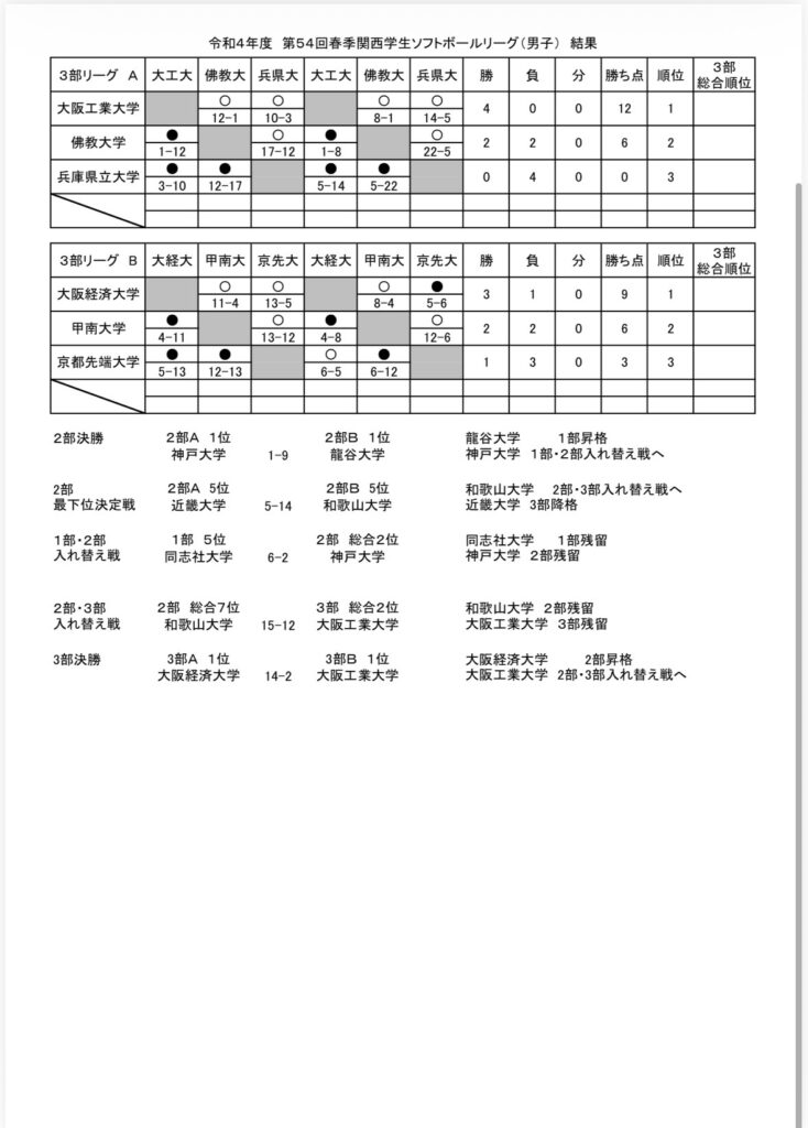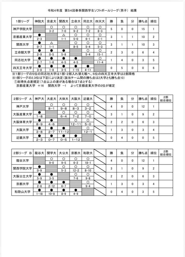 第54回春季関西学生ソフトボールリーグ(男子)結果