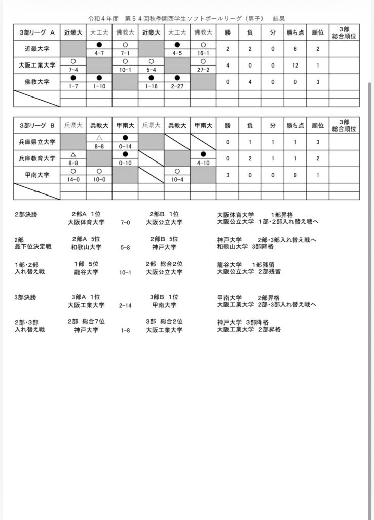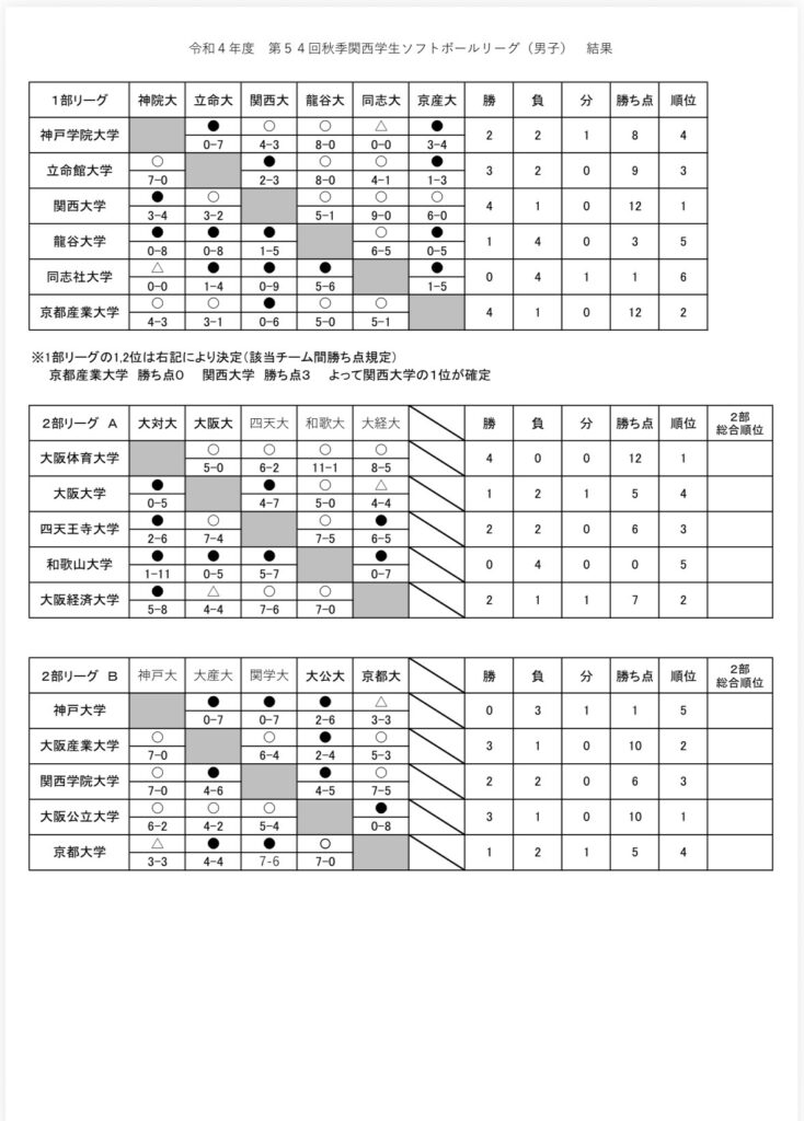 第54回秋季関西学生ソフトボールリーグ(男子)結果