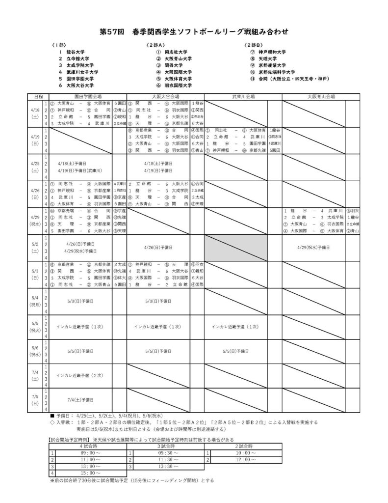 第57回春季関西学生ソフトボールリーグ戦組み合わせを公開しました